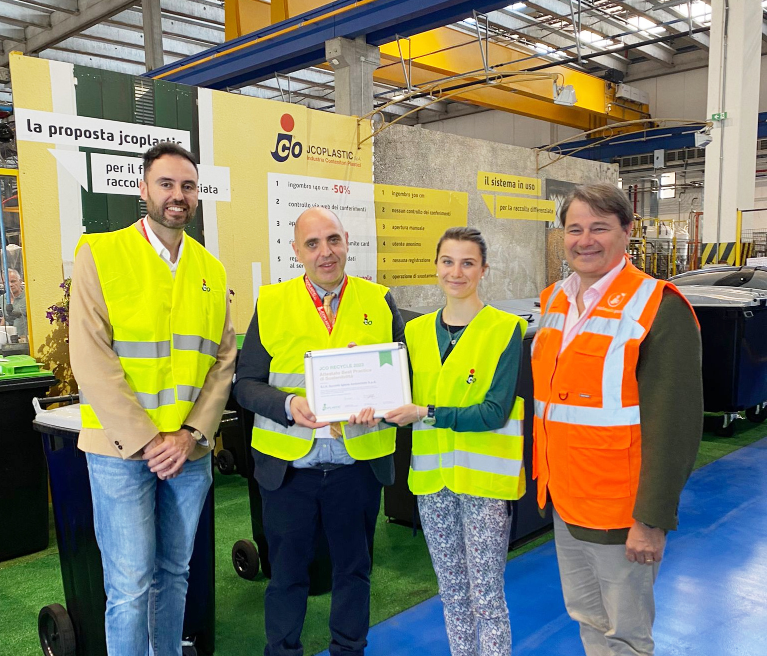 SIA ha ottenuto il riconoscimento JCO Recycle 2023, Best Practice di Sostenibilità, rispetto al proprio impegno nell’attuazione di un sistema virtuoso di economia circolare attraverso la cessione dei cassonetti a fine vita e l’acquisto di nuovi realizzati con il materiale riciclato. A conferire il riconoscimento è stata l’azienda Jcoplastic Spa, con la quale SIA collabora da molti anni e che è leader nel settore della produzione di contenitori per la raccolta differenziata e la gestione dei rifiuti. Un’azienda fondata sull’innovazione e l’impegno per la sostenibilità, che investe costantemente in ricerca e sviluppo e che attraverso l’uso di materiali riciclabili e processi produttivi efficienti mira a ridurre il suo stesso impatto ambientale.